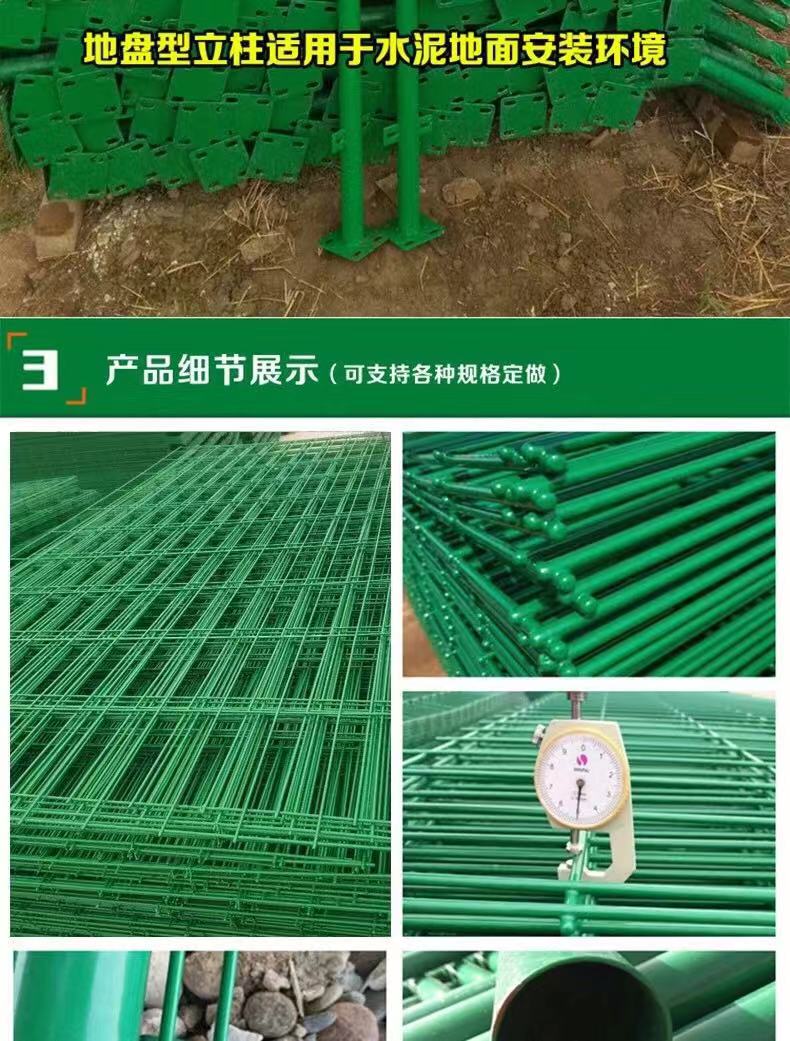 雙邊絲護(hù)欄網(wǎng)制作方法:采用優(yōu)質(zhì)盤條作為原材料,經(jīng)由鍍鋅、涂前底漆和高附著力粉末噴涂三層保護(hù)的焊接式網(wǎng)片,具有日久抗腐蝕、抗紫外線的特性。在這種護(hù)欄網(wǎng)的表面處理為鍍鋅和噴涂,也可以任選一種,頂端蓋有塑料蓋或防雨帽。根據(jù)環(huán)境和安裝方式不同,可選用預(yù)埋30cm、加底座等方式。