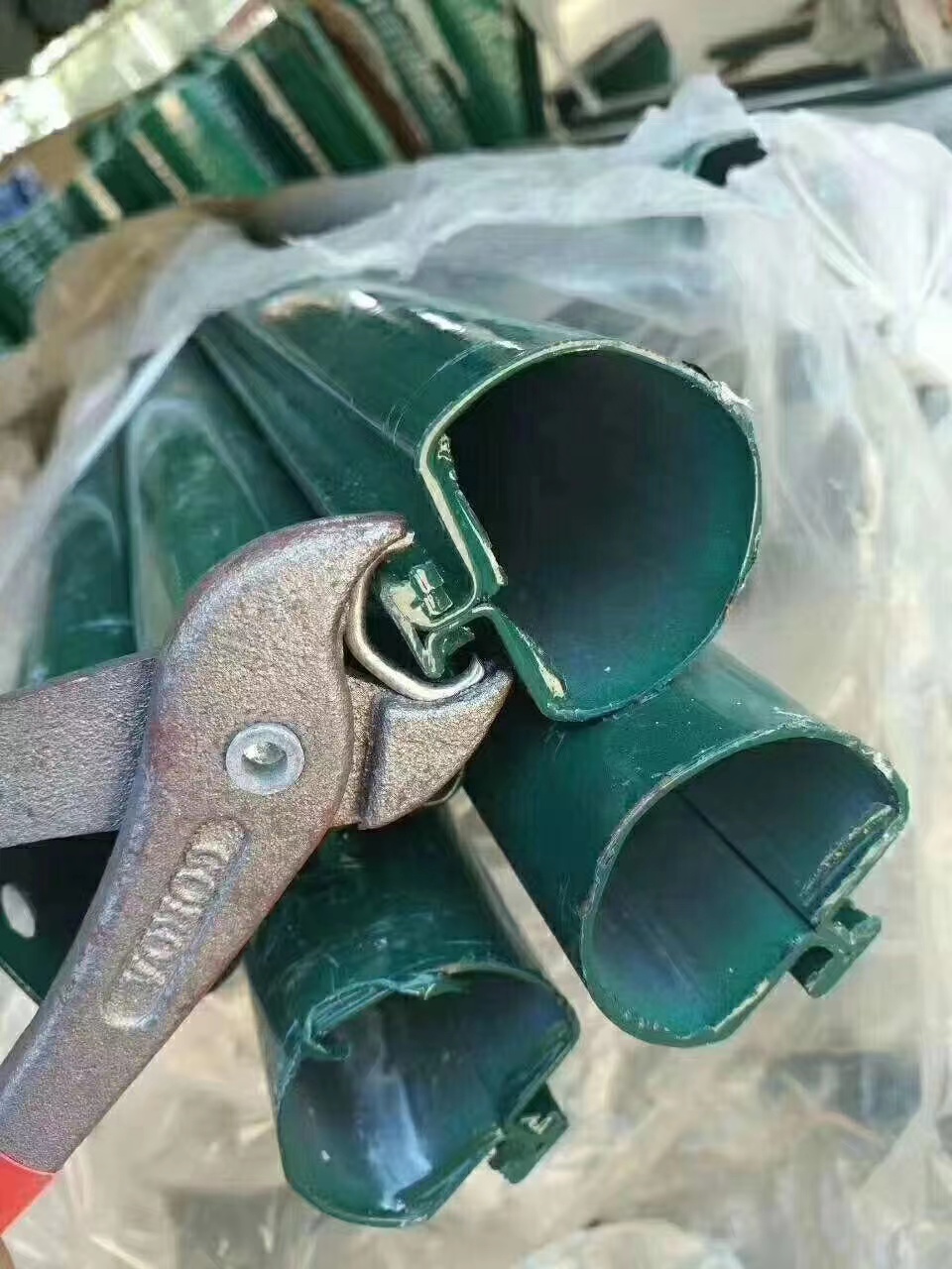 立柱配帶立柱帽、立柱與網(wǎng)片連接的卡扣、和特制工具鉗。